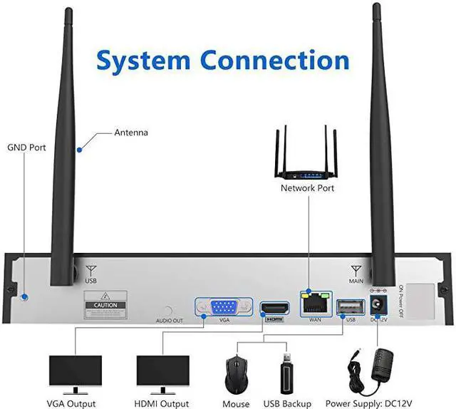 ***** *****HOW IT WORKS: Connect the cameras and NVR to the power, connect the Mouse to NVR. Connect PC/TV monitor to NVR with a VGA/HDMI Cable. Connect the Router LAN Port to NVR WAN Port with Network Cable Provided. Then, stable and stream video will be received by our professional Wifi signal transmission based on Auto Code Rate adjustment. ***** *****REMOTE