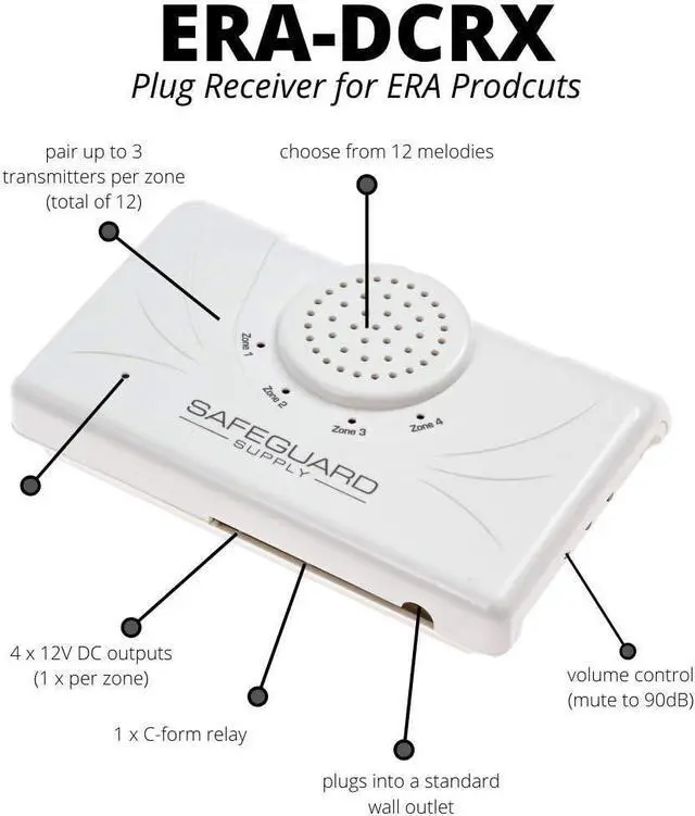 ADD-ON or REPLACEMENT WIRELESS DOORBELL RECEIVER FOR ERA SERIES by SAFEGUARD SUPPLY: use this receiver to add-on & expand your system or replace a receiver. Add this receiver to other areas or your warehouse, offices, or other parts of your store to expand the listening range of your ERA series devices.