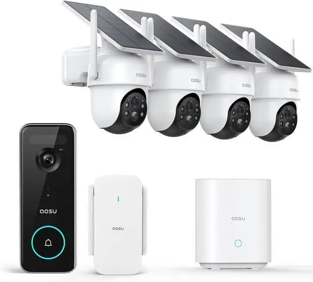 AOSU Security Cameras Outdoor Wireless, 4 Cam-Kit, No Subscription, Solar-Powered, Home Security Cameras System with 360° Pan & Tilt, Auto Tracking, 2K Color Night Vision, Easy Setup, 5G & 2.4G WiFi