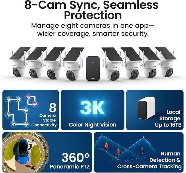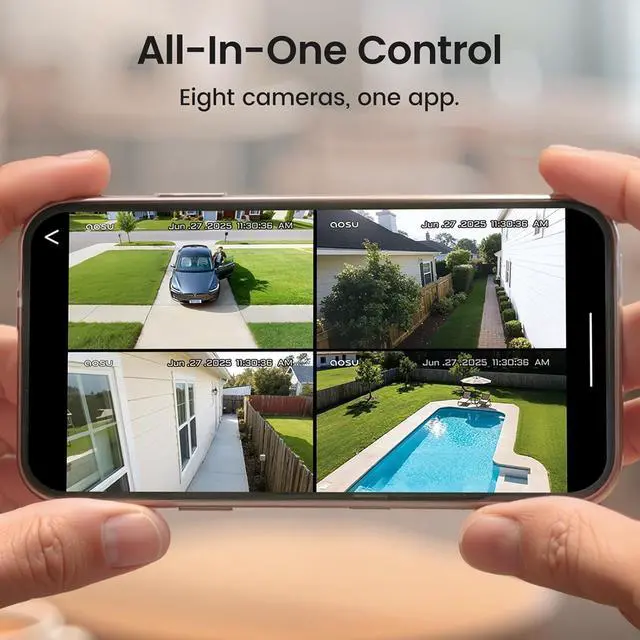 Smart AI Tracking & One-App Control - Equipped with AI Human Detection & Smart ReID (anti-disguise). Cam-to-Cam Tracking automatically stitches multiple camera footage of the same person into one timeline. Manage all 8 cams, enjoy 4-view live, and control defense settings with the single aosuCortex App.