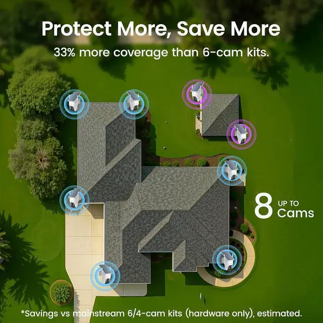 8-Cam Full Coverage - Industry-first 8-camera system provides 33%+ more coverage than 6-cam kits. Ideal for large homes, detached garages, sheds, or outbuildings, ensuring zero blind spots across your entire property.(SolarCam D1 Classic Kit does not support 8-cameras.)