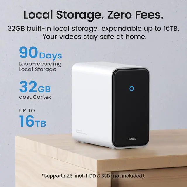 Local First, Cloud Optional - Enjoy Zero Monthly Fees for playback and recording. Features 32GB built-in local storage, expandable up to 16TB via aosuCortex for 5+ years of encrypted footage storage. Cloud storage is available for optional double backup.