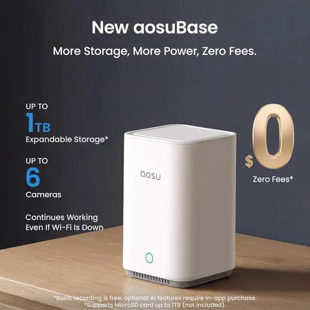 Secure Local Storage, Zero Monthly Fees Protect your home with outdoor security cameras wirelessno monthly subscriptions required. The aosuBase supports up to 1TB of local, encrypted storage, enough to store every video from your cameras securely. Everything stays private, under your control, with no hidden fees.