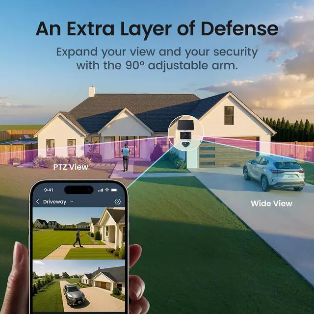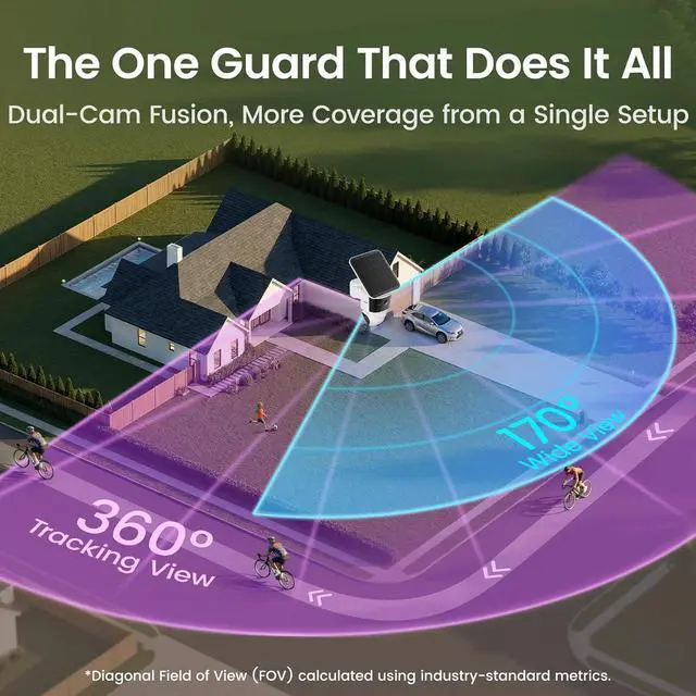 Complete Coverage with Dual Cam Technology-Say goodbye to blind spots with our innovative dual-lens system. This wireless outdoor security camera pairs a 170 degree fixed wide-angle lens with a 360 degree PTZ camera, delivering multi-direction coverage from a single device. Monitor your front yard or driveway from every angle, without the need to install multiple cameras.