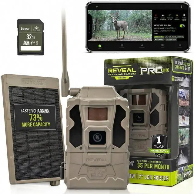 Includes Tactacam Reveal Pro 3.0 Trail Camera, Tactacam Reveal Solar Panel, and Lexar 32GB SD Card by Trail Cams Galore, a Trademarked Brand. The Tactacam Reveal Pro 3.0 is highly adaptable. It can be paired with optional accessories such as solar panels for extended battery life, and it is designed to work on multiple cellular networks, giving you flexibility in choosing your cellular provider.