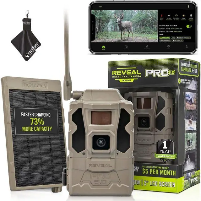 Includes Tactacam Reveal Pro 3.0 Trail Cameras, Tactacam Solar Panel and Field Boys Microfiber Cleaning Cloth by Trail Cams Galore, a Trademarked Brand.. The Tactacam Reveal Pro 3.0 is highly adaptable. It can be paired with optional accessories such as solar panels for extended battery life, and it is designed to work on multiple cellular networks, giving you flexibility in choosing your cellular provider.