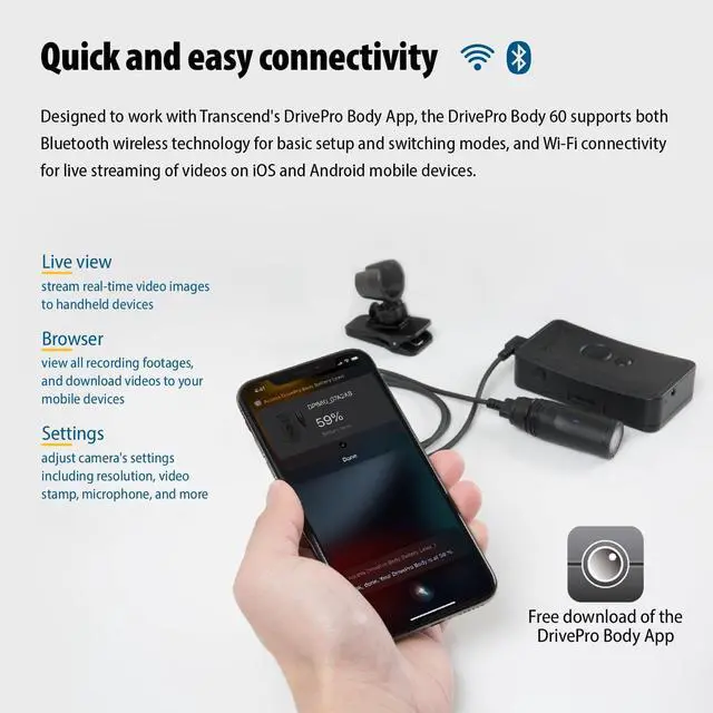 Wireless Connectivity: Supports Bluetooth for basic setup and mode switching, and Wi-Fi for live streaming to iOS and Android devices via the DrivePro Body App.