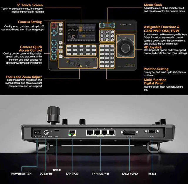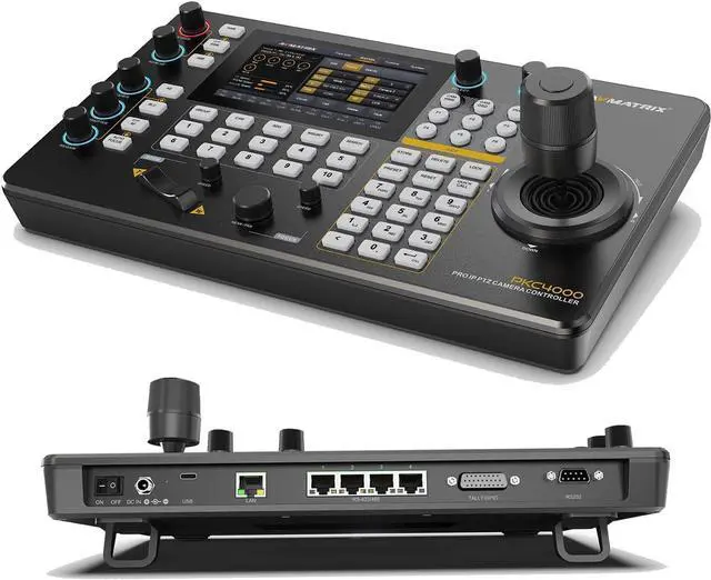 Improve productivityThis ptz camera controller achieve streamlined production with one person, PTZ camera controller provides shortcut keys, a camera operator can easily: quickly access the camera, movement, auto focus, Iris, Shutter, backlight, presets, Pan Tilt Speed, FOCUS SPEED, ZOOM SPEED, START and STOP TRACKING(Under visca over ip mode) and more. Having 6 user-defined/custom keys etc.