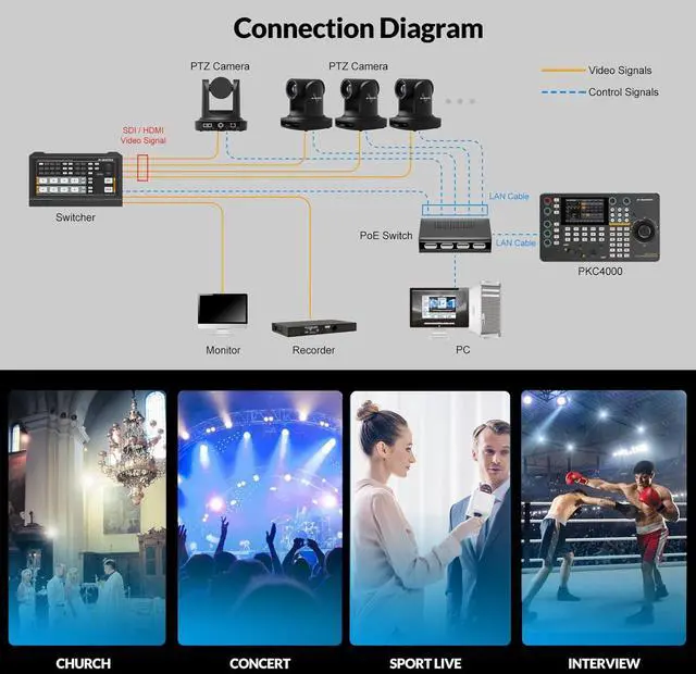 Support PoE power supply providing traditional DC-AC power supply and Power over Ethernet (PoE). Allows control of cameras throughout the network via a single Ethernet cable connection, up to 255. Compatible well with PTZ Cameras, NDI Cameras, even most brands of PTZ Cameras in the market.