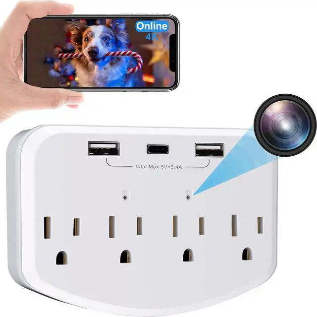 Update 4-in-1 function cameraThis surveillance camera is masterfully designed as a fully functional power outlet, seamlessly integrating into any room. Included 4 AC socket extenders (120V, 15A, 1200W), 3 USB PD fast charging ports (3.4A, 20W), 1700 Joule surge protectors and a mini camera, surface material flame retardant, heat resistant up to 248°F, can be used as sockets. (Note: For safety, do not use with high-power appliances like electric kettles.)