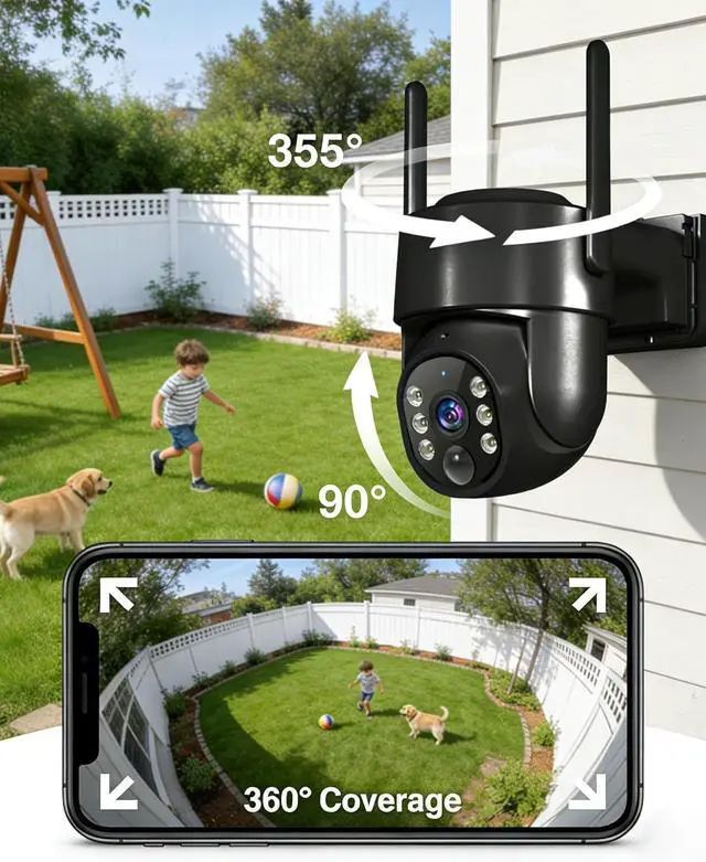 • 360° Pan-Tilt Coverage & IP65 Weatherproof: Remotely pan, tilt, and zoom through the app to monitor every corner of your property. Built with an IP65 waterproof rating, this wireless outdoor camera performs reliably in rain, snow, dust, and extreme temperatures year-round.