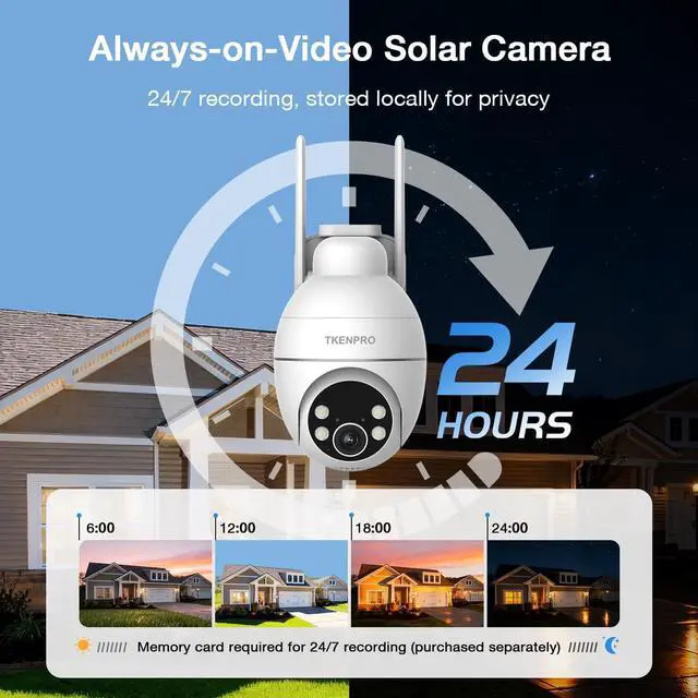 24/7 Recording Outdoor Camera: Our TKENPRO solar outdoor camera utilizes low frame rate recording when theres no activity to conserve power. But when motion is detected, it instantly switches to high frame rate, capturing every detail in crisp clarity. So you will never worry about missing critical evidence. The continuous recording security camera can track suspicious activity day or night with ease.
