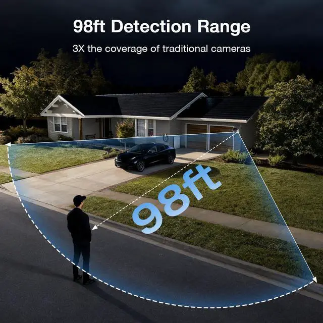 98ft AI Smart Detection: With our security cameras wireless outdoor, you get the peace of mind that comes with extended coverage. Its AI detection range spans up to 98ft three times the distance of normal solar cameras. Whether its a vehicle approaching or someone walking near your driveway, the wireless outdoor camera instantly tracks and records, protecting your home from further away.