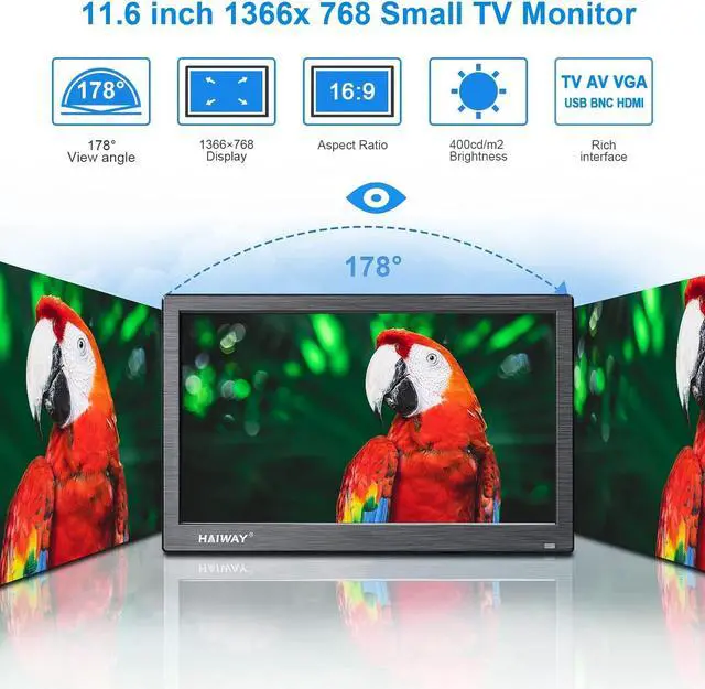 Ultra HD Mini LED Monitor: Haiway 11.6 inch monitor comes with 1366*768 resolution and 16:9 ratio. HD LED display at richer color image with a 800:1 contrast ratio makes the image quality is more delicate and realistic. 178° wide view angle demonstrate a super-exclusive imaging capability and delivers you awesome viewing experience.