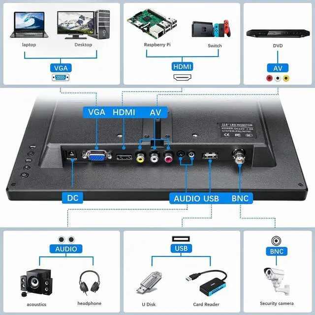 Multi Interface and Applications: Multi-Ports Design Brings You More Choices. HDMI port for Laptop, Raspberry Pi, DSLR, or other devices with HDMI port use. Monitor for firestick, you can use it as a small TV; VGA port for PC, connected as a small computer monitor; Connected BNC port as a security monitor; AV port for DVD, VCD, TV-Box. (Note: VGA is without audio, the VGA cable can only transmit images, but not sound; USB Port support MP3 MP4 Format, do not support powered)