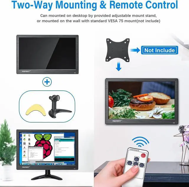 Wall Install & Stand Install: This small HDMI monitor can be easily mounted on the wall with the VESA 75 mount (not included) Or mounted on the desktop by provided adjus