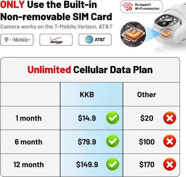 Unlimited Data & Live ViewingKKB 4G LTE Security Camera only supports the built-in SIM card (non-replaceable) to connect to Verizon, T-Mobile, and AT&T's 4G cellular network to ensure compatibility and stability. 300MB prepaid data is provided for connecting the camera. Data plans are renewable within the app at 14.9 USD/month, 79.9 USD/6 months, 139.9 USD/year. Enjoy unlimited data any time you want to watch