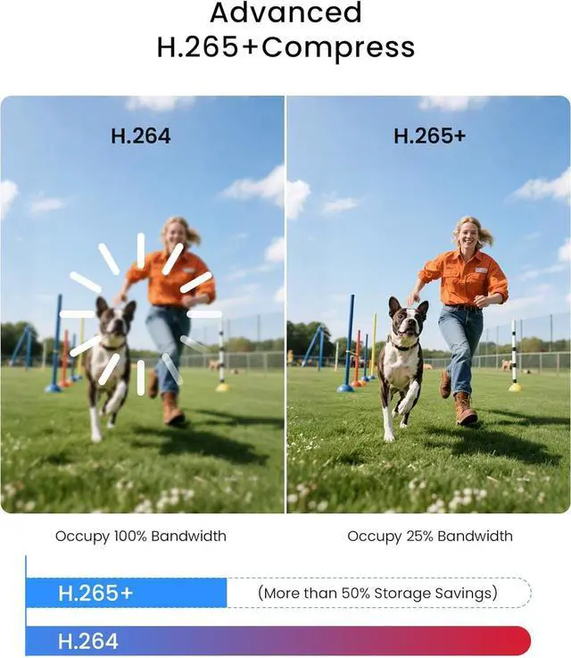 (3). [ Advanced H.265+ High Efficiency Video Compression ] __ ZOSI's self-developed H.265+ video coding technology extracts features focusing on surveillance scenes, increasing storage space