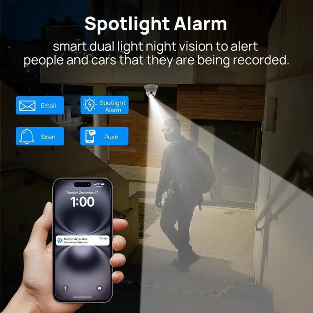Smart Dual Light with AI Color Night Vision:Enhance low light image sensor and chipset that allows for up to 98ft full night vision, in color;Smart Dual Light technology adopts smart algorithm to detect targets. Usually, the IR illuminator is on at night when the target appears in the monitoring area, the white light is on, and the camera records the full-color video and information of key events. When the target is out of the monitoring area,the IR illuminator is on, which reduces light pollution efficiently