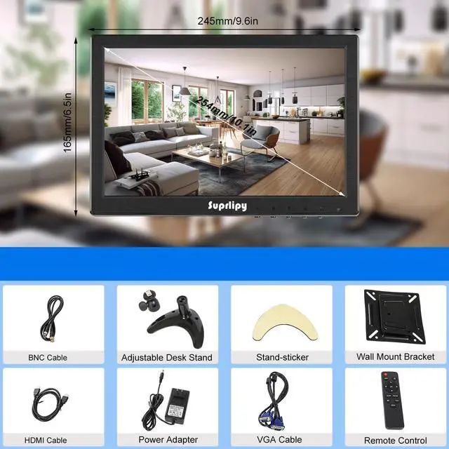 FHD 1200P Small MonitorElevate your viewing experience with the Suprlipy 10" FHD IPS monitor, boasting a crisp 1920x1200 resolution. With a 16:10 aspect ratio and a 178° wide viewing angle, this small monitor offers a broader perspective, making it ideal for both professional work and personal media consumption.