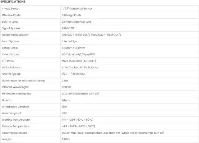 1/2.8 Mega Pixel Sensor Upgraded to 4 In 1 Video Signal ( TVI , AHD , CVI , Analog ) 2.8mm Wide Fixed Mega Pixel Lens Weather-Proof : IP66 24pcs IR Leds, 15m IR Distance , 12V DC