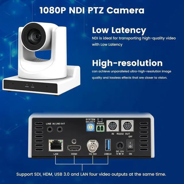 PTZ Camera Support 3G-SDIUSB 3.0 simultaneous outputs, IP Live Streaming Video Output.Supports PoE(802.3af) and H.264/H.265 encoding which makes motion video more fluent and clear under low bandwidth conditions