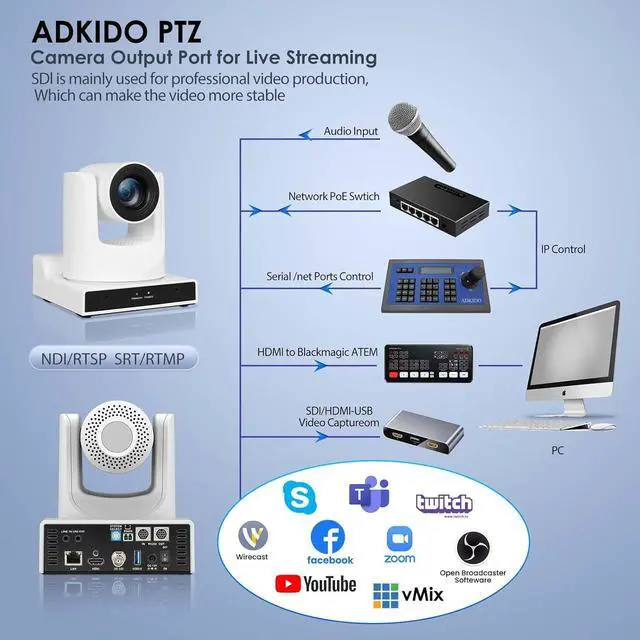 SDI camera supports remote control and easily control the pan, tilt and zoom of the HDMI ptz camera via IR remote control/network portal/network interface/RS232/RS485/IP. The head can be rotated up and down -30°~+90°, and the body can be rotated left and right ±170°. If you want to have start or stop tracking function over joystick, pls choose ADKIDO Joystick Controller