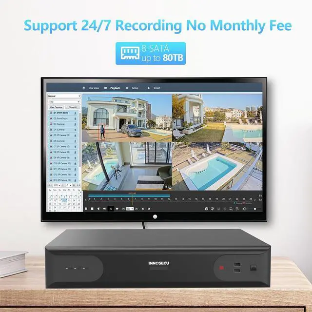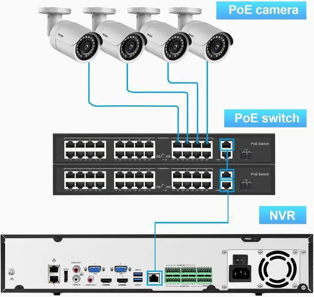 Plug&Play with PoE: This NVR Works with a standard PoE switch/injector that provides power and data transmission through a single cable for PoE cameras. It is plug-and-play for easy installation. (Not including the PoE switch/injector)