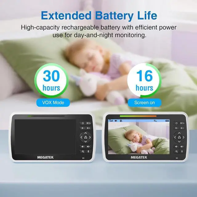 Up to 30-Hour Battery with VOX Mode: Long-lasting rechargeable battery delivers up to 30 hours of monitoring. VOX sound activation turns the screen on automatically when your baby makes noise.