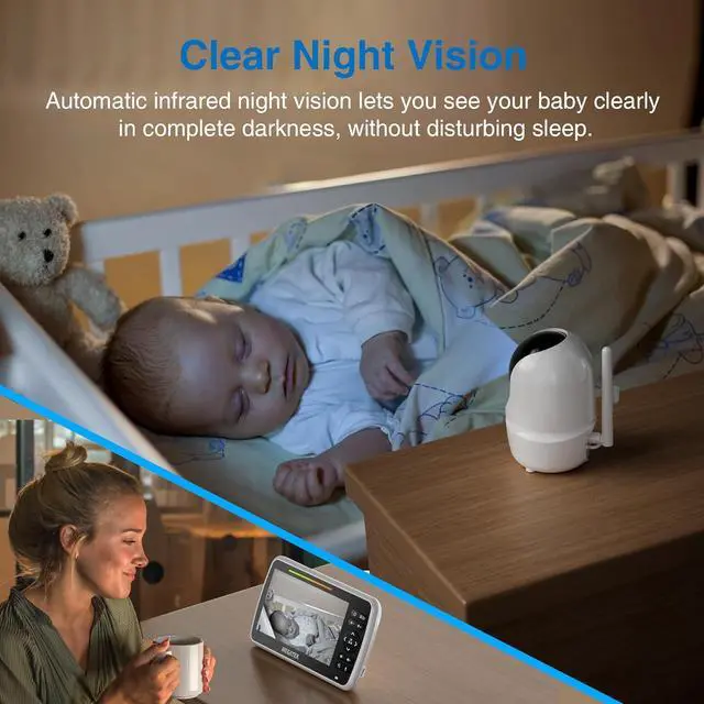 Night Vision, Two-Way Talk & 8 Built-In Lullabies: Infrared night vision lets you see clearly in the dark. Two-way talk allows you to comfort your baby remotely, while 8 built-in lullabies help soothe your baby to sleep.