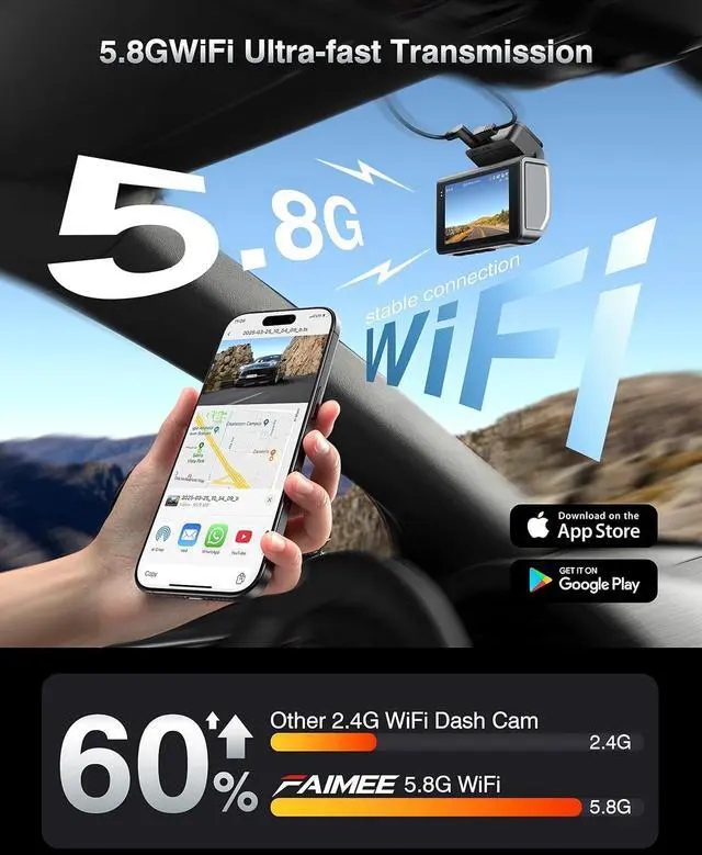 STABLE CONNECTION WITHOUT DROPOUTS: Dash cam front and rear built-in GPS and upgraded dual-band 5.8ghz/2.4ghz WiFi integration allows real-time video streaming and instant downloads via the app. Built-in GPS logs speed, route, and location data, ideal for fleet management or travel! With always-on 5GHz Wi-Fi, reducing lag during liveview, you can more easily access videos and photos recorded on your phone through "FAIMEE" App, and share travel moments to your family and friends on social media.