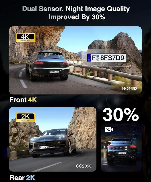4K+2K DUAL RECORDING ULTRA SHARP AND EXTRA WIDE VIEW: Adopting f1.5 ultra-large aperture and excellent optics, the 4K Dash Cam front and rear dual lenses are utilized to capture every detail, providing 170°wide-angle coverage for 6-lane road visibility. Enhanced WDR and sharper night vision technology ensures crystal clear images in low light or high contrast conditions (e.g. tunnels, nighttime driving), ideal for accident forensics or scenic travel.