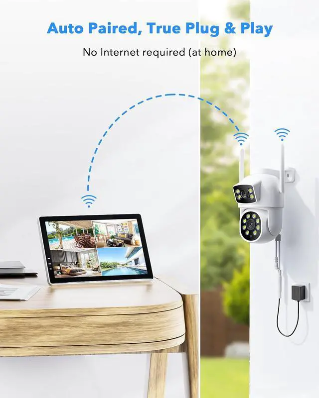 All-In-One, Plug & Play: Camcamp dual lens security camera comes with a 10.1" LCD monitor (NOT TOUCHSCREEN), all wifi cameras are auto-paired to the NVR monitor during the factory setting. 5min Installation, just plug in the outdoor cameras and nvr monitor into the power supply to get the live video, true plug and play. (NOTE: all cameras need to plug in the power all the time)