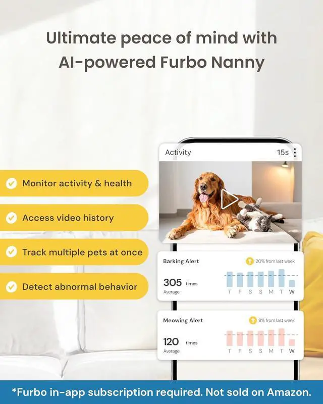 PEACE OF MIND AT HOME: Designed to watch over your pet, Furbo Nanny sends real-time alerts and smart insights, plus includes 37 days of video history so you ca