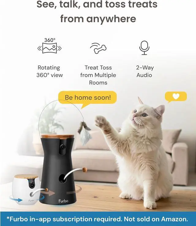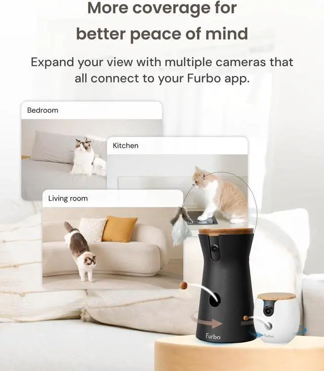 MORE COVERAGE: Keep your cat safe and happy when you're away with the new Furbo 360° Cat Camera + Mini 360° Nanny Subscription Bundle. With 2 treat-tossing cameras to position around your home, you'll be able to record and save your cats most precious moments with a rotating 360° wide-angle lens, up to 2K QHD visibility, 8X HD Zoom, Selfie Alerts, Video History, Kitty Diary and more. See from multiple rooms and stay in the know from anywhere.