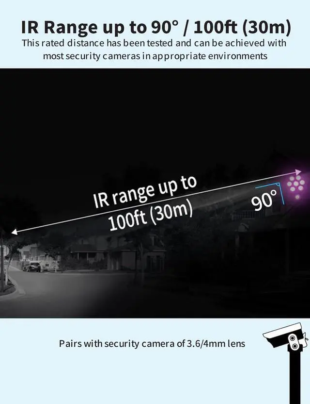 [Installation]- Please install the IR light beside the camera and point the same direction as your camera. Please make sure that your camera works well with 850nm ir light before ordering. Youll get full package includes infrared illuminator, 12V/1A adapter, installing screws and user manual