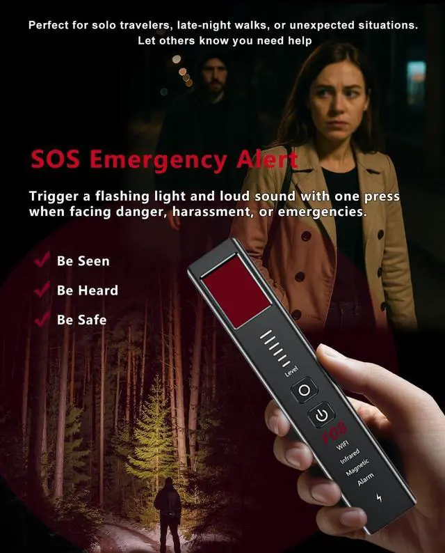 Emergency SOS Alert for Dangerous Situations: In emergencies like robbery or getting lost, activate the SOS alert mode to emit flashing lights and a sharp beeping alarm in Morse code, drawing attention and buying time. A must-have hidden devices detector for solo travelers, outdoor enthusiasts, women and those living alone