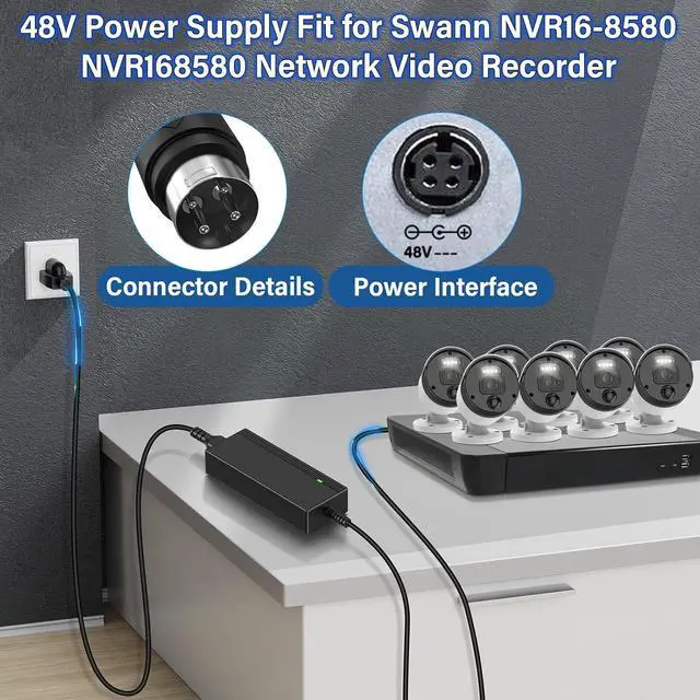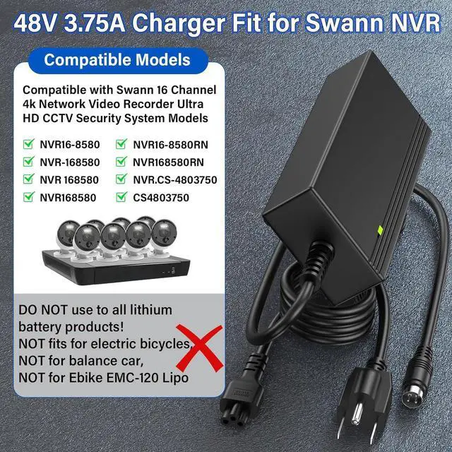 Compatible Models: The replacement DVR charger cord is only compatible with Swann NVR16-8580 NVR168580 16 Channel 4k Network Video Recorder Ultra HD CCTV Security System; fits for Swann models NVR16-8580RN NVR168580RN NVR-168580 NVR168580 NVR. CS-4803750 CS4803750 48VDC 3.75A 180W