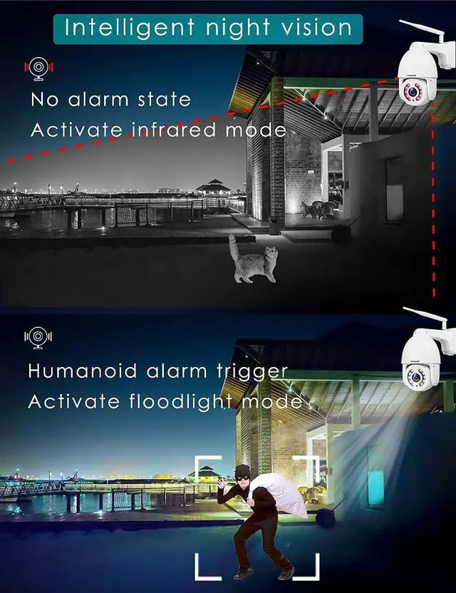 [ AI Color Night Vision ]: This outdoor security camera built-in 10pcs multi-function LEDs and can get a night vision distance of 130ft at least. Three mode: infrared/ spotlight/ smart mode. Under the smart mode, this outside surveillance camera will turn on the floodlight when the humanoid detection triggerred and restore the infrared mode after the alarm ends