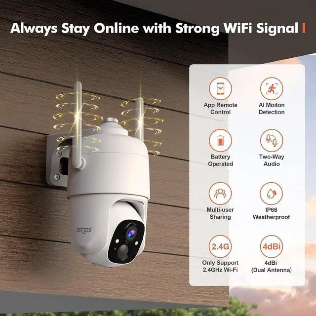 100% Wire-Free & Eco-Friendly Solar Powered: Powered by built-in rechargeable batteries, Dzees outdoor camera ensures non-stop performance even in the absence of power outlets. The upgraded antenna ensures stable WiFi connection, eliminating the need for cables or offline devices.