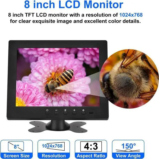 High resolution 8 inch 1024*768 high resolution LCD security monitors for home, 500:1 dynamic contrast ratio, 300cd/ brightness, 16:9 aspect ratio and 150° wide viewing angle, showing delicate colors and clear imaging ability to bring users a comfortable and spectacular viewing experience.