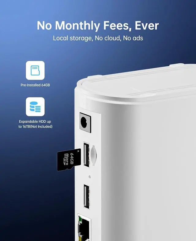 No Monthly Fees Ever Enjoy full local storage with included 64GB card and expandable HDD up to 8TB. No cloud, no hidden costs, complete privacy.