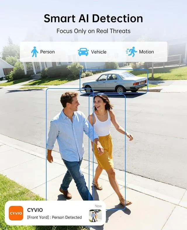 Smart Detection & Instant Protection Advanced PIR + AI detection identifies people and vehicles, while spotlight and siren actively deter intruders in real time.