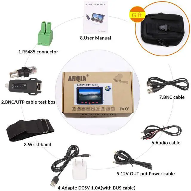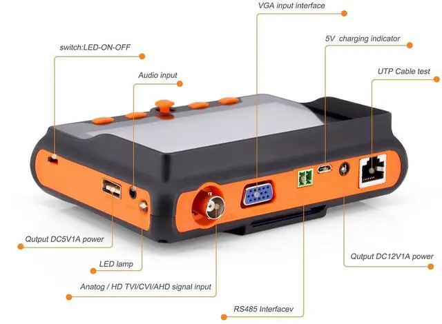 Support 5mp TVI, AHD HD coaxial camera, support 4mp CVI high-definition coaxial camera, and compatible (720p, 960p, 1080p) CVI, TVI, AHD HD coaxial camera and support (CVBS) analog camera, audio signal input test: test The sound is normal, it also comes with a DC 12V 1A output, can give camera power supply