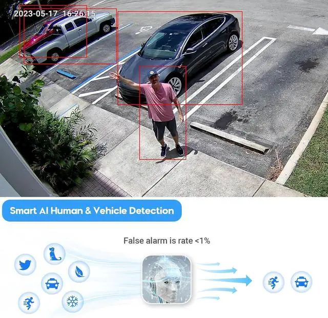 Accurate Human&Vehicle Detection, Two-Way Audio IntercomMotion detection 2.0 can reduce false alarms with up to 99% accuracy. You can set the line/zone to scare away the unwelcome by triggering the customizable siren when it detects. With the inserted Mic, the sound&image can be recorded simultaneously and two-way talk at any time.in addition to sending push notifications to your phone, the camera also has flashing lights and speakers to alert people and cars that they are being recorded