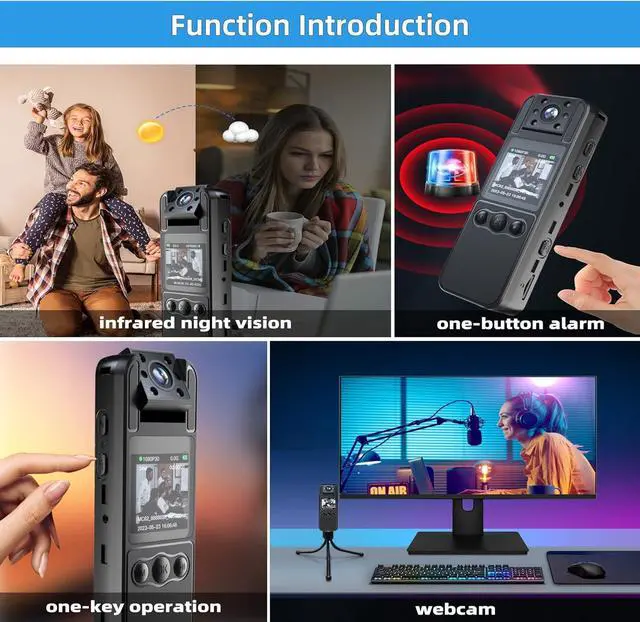 One Key Operation & Multi Function: The mini body cam supports one key to Record Audio, Video and Take Photograh, not need to power on the cam. Short press alarm light, the camera will sound an alarm and flash red and blue warning lights.