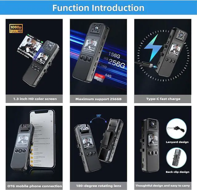 180° Rotatable Lens: The body camera with 180° rotatable full HD lens, it can adjust the shooting angle according to needs, you will always see the recorded footage in real time, no matter where the lens is turned.