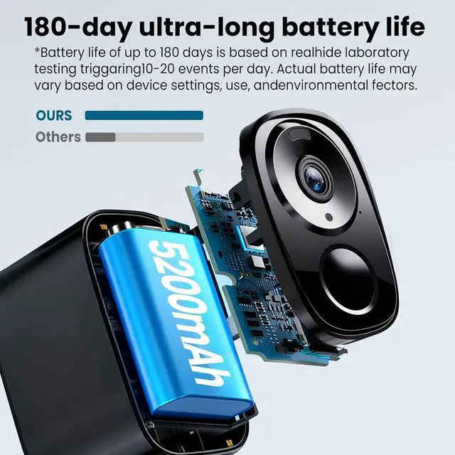 Up to 6-Month Battery Life Truly Worry-Free No more taking the security camera down every few weeks. The high-capacity rechargeable battery delivers up to 6 months of power (varies by detection), making it perfect for driveways, porches, yards, or remote areas without outlets.