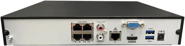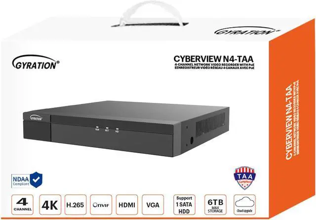 The Gyration CyberView N4-TAA Network Video Recorder (NVR) supports up to four (4) IP cameras and provides up to 4K high-definition recording for your IP video surveillance applications. It is also compatible with Ultra 265, H. 265, and H. 264 video compression formats. The CyberView N4 is ideal for a variety of circumstances where image details are critical for identification, such as residential areas,