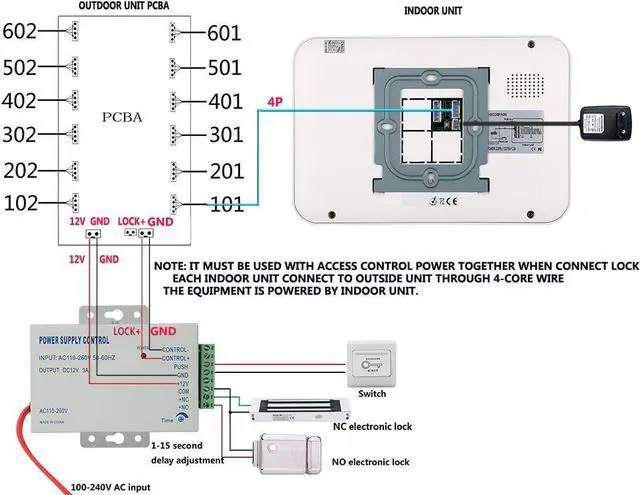 Stable Wired ConnectionOur wifi video intercom system is 4pin wired Connection, but the 7" touch monitor supports WIFI network. The indoor monitor and doorbell are wired for stable power and video, with longer distance extension. Visual intercom system doorbell provide multi-languages OSD menu,The system supports twelve different languages. The indoor monitor can support to connect 5 mobile phone APP user, Support IOS/Android system mobile phone , then the mobile phone can view and unlock.